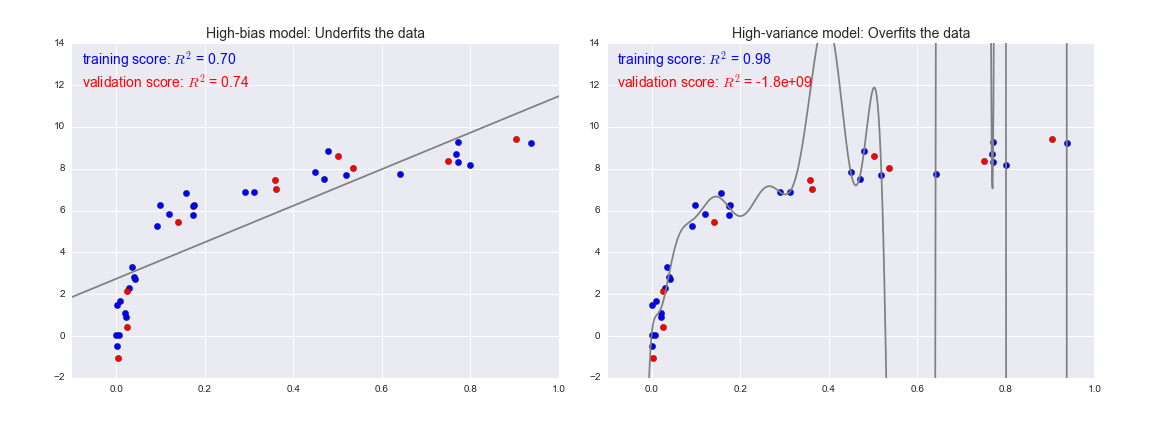 The model on the left attempts to find a straight-line fit through the data. Because the data are intrinsically more complicated than a straight line, the straight-line model will never be able to describe this dataset well. Such a model is said to underfit the data: that is, it does not have enough model flexibility to suitably account for all the features in the data; another way of saying this is that the model has high bias.