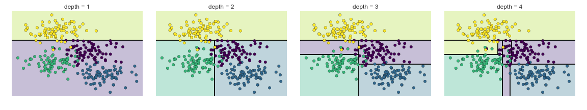 A simple decision tree built on this data will iteratively split the data along one or the other axis according to some quantitative criterion, and at each level assign the label of the new region according to a majority vote of points within it. This figure presents a visualization of the first four levels of a decision tree classifier for this data: