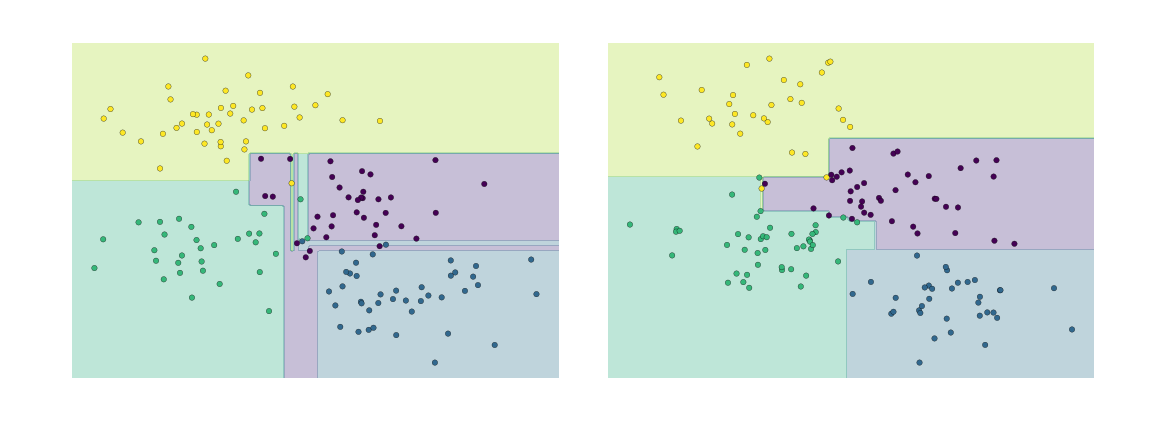 Such over-fitting turns out to be a general property of decision trees: it is very easy to go too deep in the tree, and thus to fit details of the particular data rather than the overall properties of the distributions they are drawn from. Another way to see this over-fitting is to look at models trained on different subsets of the data—for example, in this figure we train two different trees, each on half of the original data:
